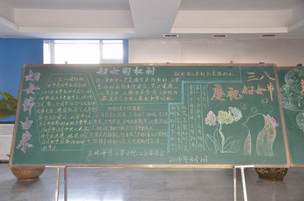 3月4日学校工会组织出版了一期主题为“维护妇女权利,关爱女性健康”的板报。板报分两部分内容:一是介绍“三八”节的由来和妇女有哪些权利,使全校女教工从中受到鼓舞,更加明确自己在学校发展和建设中的重要作用;二是关爱女性健康,介绍了一些妇女保健小常识,从而提高女教工的幸福指数。