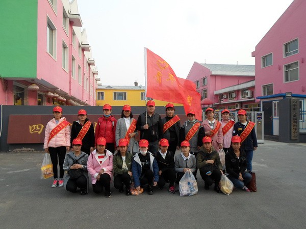 18名同学打着“青年志愿者”的红旗,戴着印有金色的“青年志愿者”的红帽,配上红色的绶带,带着精心挑选的软面包、各种水果、酸奶等慰问品,列队整齐地跟随院养护部王主任进入儿童福利院的大楼。