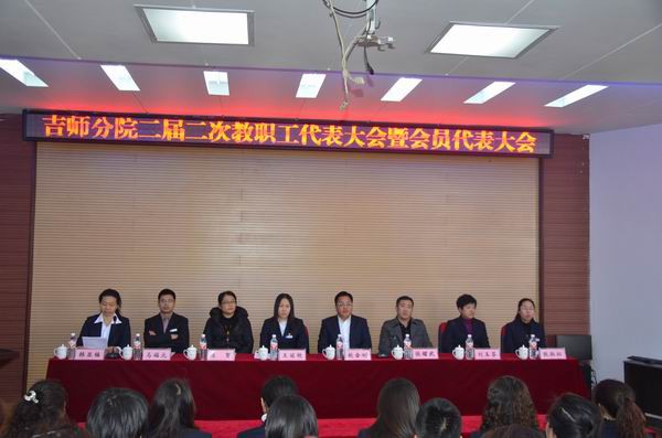 大会的中心议题是:抓特色建设,促内涵发展,建和谐校园。会议由吉林师范大学分院工会主席韩亚楠同志主持,党委副书记、纪委书记王丽艳同志致开幕词,四平教育工会主席张耀武同志作了重要讲话。会议听取并审议通过了院长赵金刚同志作的题为《戮力同心 坚定前行 谱写吉师分院科学发展新篇章》的工作报告和副院长马福元同志作的《学校财务工作报告》,整个会议充满了融洽、活泼、民主的气氛。