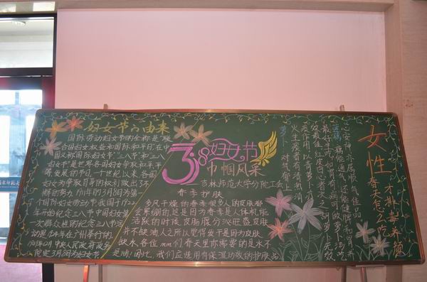 3月4日学校工会组织出版了一期题为《巾帼风采 美丽三·八》的板报。板报分两部分内容:一是介绍“三·八”节的由来,使全校女教工从中受到鼓舞,更加明确自己在学校发展和建设中的重要作用;二是关爱女性健康,介绍了一些春季护肤、排毒养颜的小常识,从而提高女教工的幸福指数。