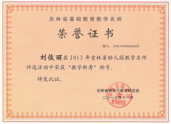 2014年3月我市有2名幼儿教师荣获吉林省教育厅颁发的“教学精英”和“教学新秀”荣誉称号。