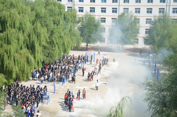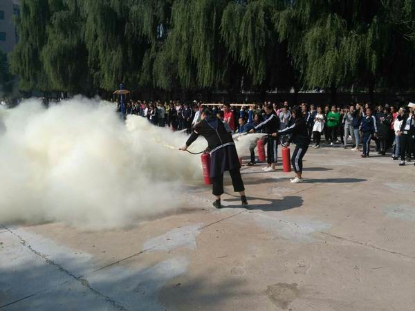 在演练现场,保卫处处长王建英向大家讲解了消防知识和灭火器的使用方法。他特别提醒大家,进入秋季后,由于空气干燥易引发火患,必须提高防火意识。随后,学生进行分组模拟练习,学生处主任、各班班主任和保卫处人员进行分组指导,在练习中训练学生正确操作灭火器。模拟练习后,每个班级派若干名学生代表参加实战演练,同学们都能按照王处长的讲解规范使用灭火器,迅速准确扑灭着火点。