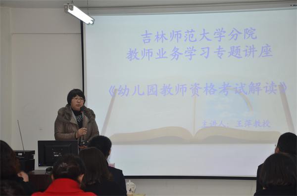 为帮助广大教师充分了解和重视幼儿园教师资格考试的相关要求和信息,提高教师的业务能力,更新教育教学理念,11月2日下午,我院特邀东北师范大学学前教育学院院长、博士生导师王萍教授来校作题为《幼儿园教师资格考试解读》的专题讲座,针对幼儿园教师资格考试为全校教师进行解读。
