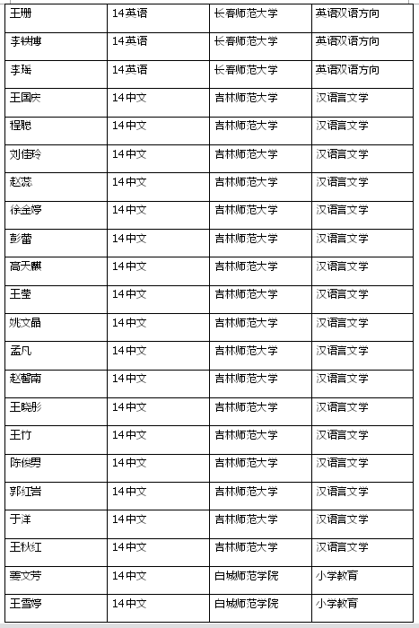 在2017年吉林省普通高等学校“专升本”考试中我校学生再创佳绩。共59名同学(汉语言文学专业23人、小学教育专业11人、学前教育专业21人、英语双语方向4人)分别被吉林师范大学、长春师范大学、北华大学、白城师范学院录取。学校向在本次“专升本”考试中取得优异成绩的同学表示热烈地祝贺!向辛勤付出的老师们表示衷心地感谢!希望在校的学生以他们为榜样,刻苦学习,努力拼搏,再创辉煌!