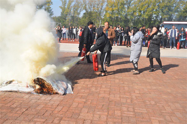 在演练现场,保卫处处长王建英向大家讲解了消防知识和灭火器的使用方法。他特别提醒大家,进入秋季后,由于空气干燥易引发火患,必须提高防火意识。随后,学生进行分组模拟练习,学生处主任、各班班主任和保卫处人员进行分组指导,在练习中训练学生正确操作灭火器。模拟练习后,每个班级派若干名学生代表参加实战演练,同学们都能按照王处长的讲解规范使用灭火器,迅速准确扑灭着火点。