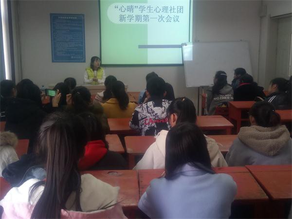 会上,曹老师对上学期的社团工作进行了总结,对工作积极表现优秀的社团成员给予肯定和表扬,并对新学期即将开展的社团活动进行部署:一是围绕“5.25”大学生心理健康日设计了大学生心理健康月系列活动,即利用校园广播、板报宣传心理健康知识、开展心理健康讲座、大型团体心理游戏辅导、校园心理剧展演,以帮助学生解决适应性问题、学习问题、人际交往及情感等方面问题,提高学生的心理健康水平;二是心理社团常规活动安排,设计安排了沙盘游戏体验、心理沙龙、QQ群话题交流讨论、 朋辈心理辅导,让同学自行思考、感受、相互影响,共同进步;三是开展心理电影赏析活动,以丰富学生辨别、自我调节能力。